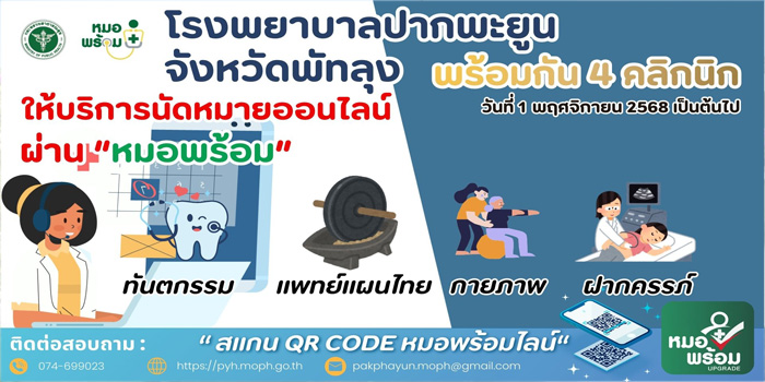 - โรงพยาบาลปากพะยูน ได้รับการตรวจเยี่ยมเพื่อเฝ้าระวังเเละธำรงคุณภาพระหว่างการต่ออายุการรับรอง (Surveillance workshop) ปี 2569 รุ่นที่ 5 จาก สถาบันรับรองคุณภาพสถานพยาบาล (สรพ.)