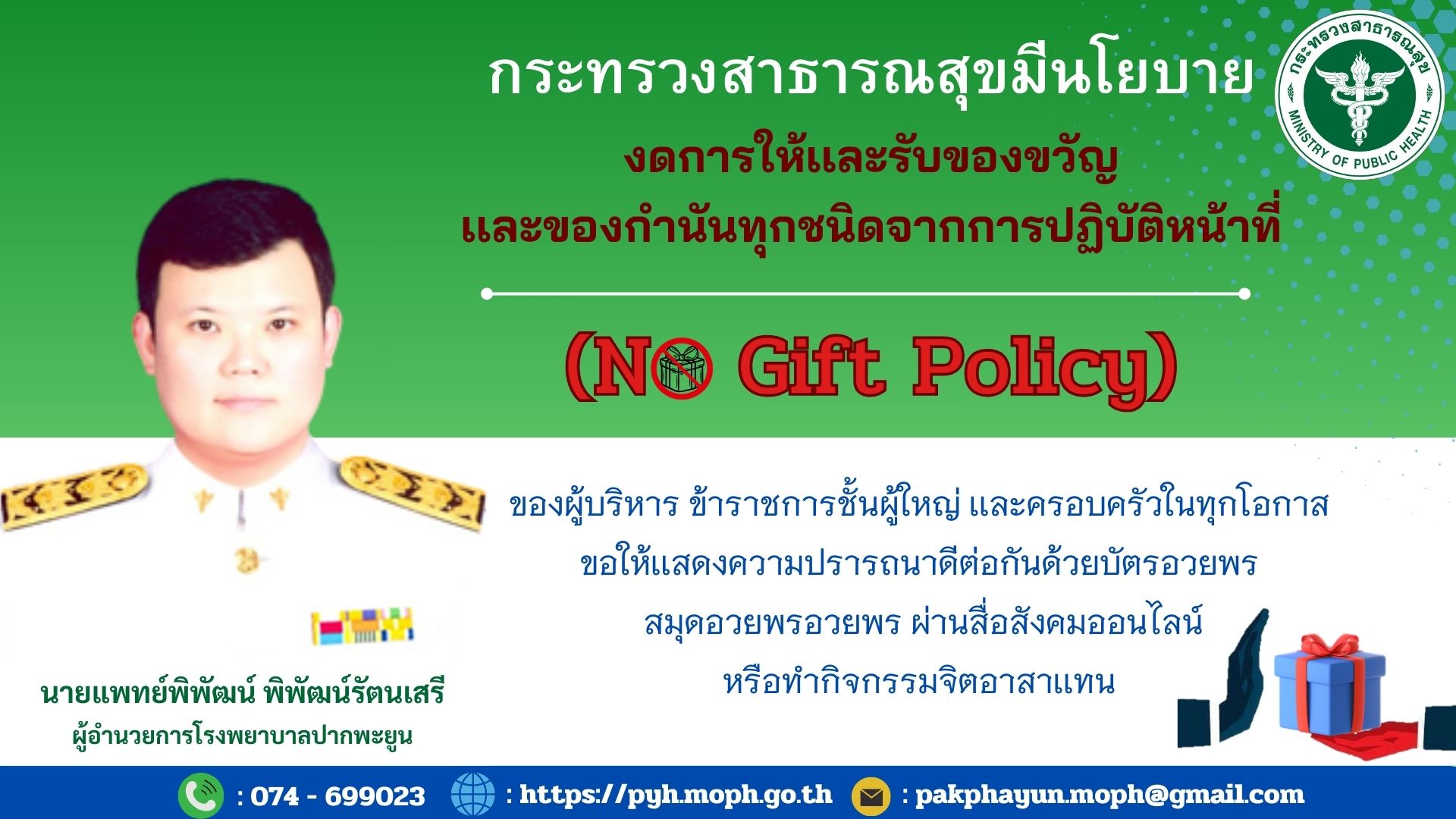 1. มีประกาศเจตนารมณ์เป็นหน่วยงานที่เจ้าหน้าที่ของรัฐทุกคนไม่รับของขวัญ และของกำนัลทุกชนิดจากการปฏิบัติหน้าที่ (No Gift Policy) ของปีงบประมาณ พ.ศ. 2569 ที่มีลักษณะเป็น Inforgraphic No Gift Policy ในนามหัวหน้าหน่วยงานอยู่หน้าเว็บไซต์หลักของหน่วยงาน