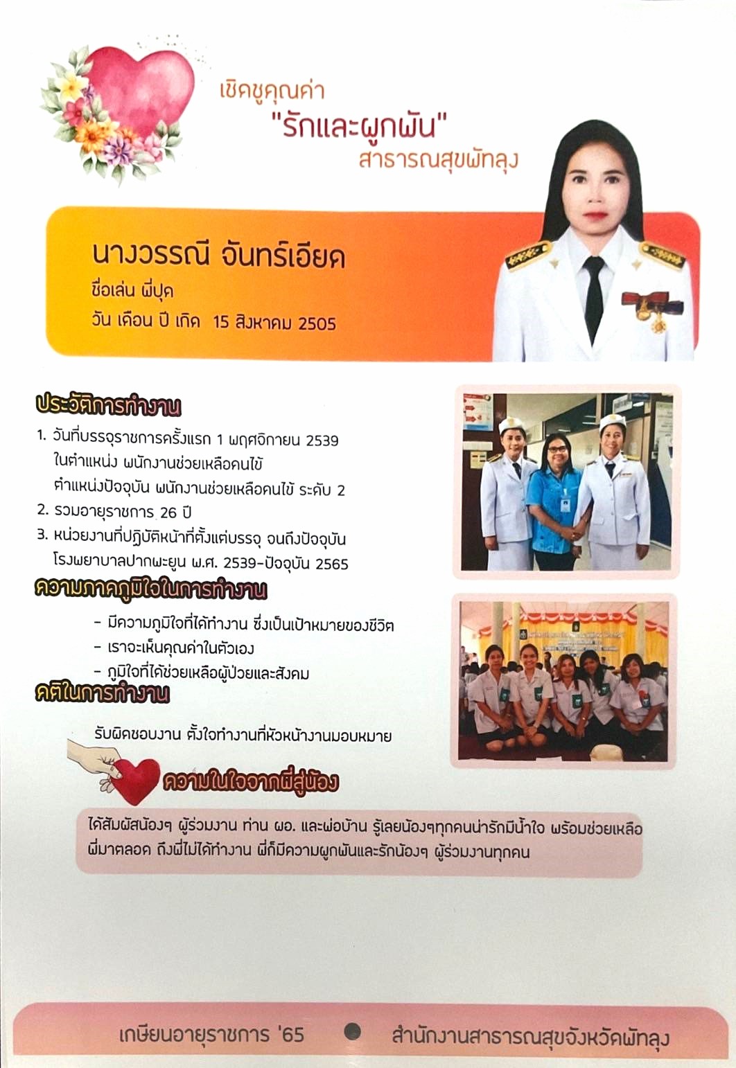 "เกษียณอายุราชการ ปี 65" นางวรรณี จันทร์เอียด ตำแหน่งพนักงานช่วยเหลือคนไข้ โรงพยาบาลปากพะยูน